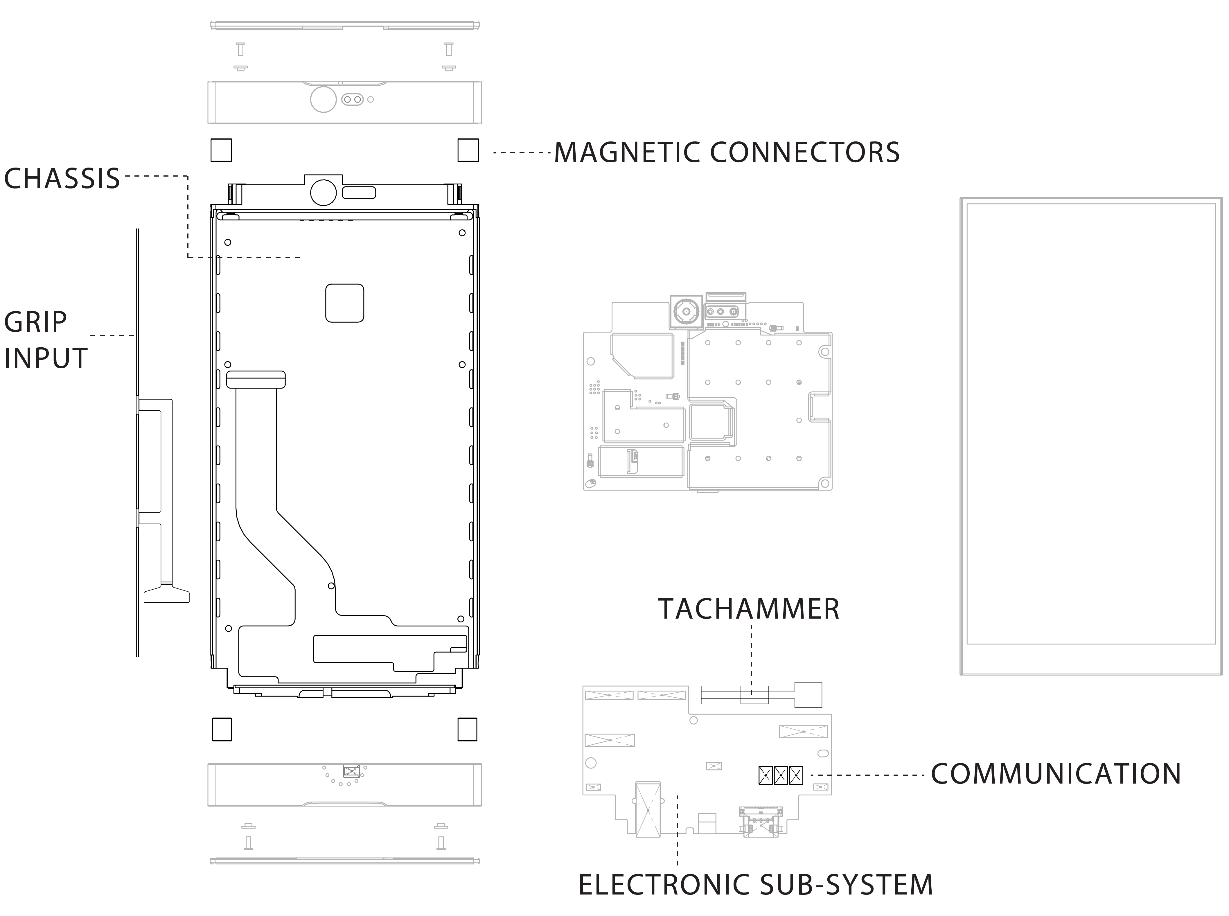 Provides access to peripheral IOs that interface with Magnetic connectors, wireless communications, pressure sensitive inputs. Modular electronics design enables quick prototyping of new components and electronics without replacing the main board.